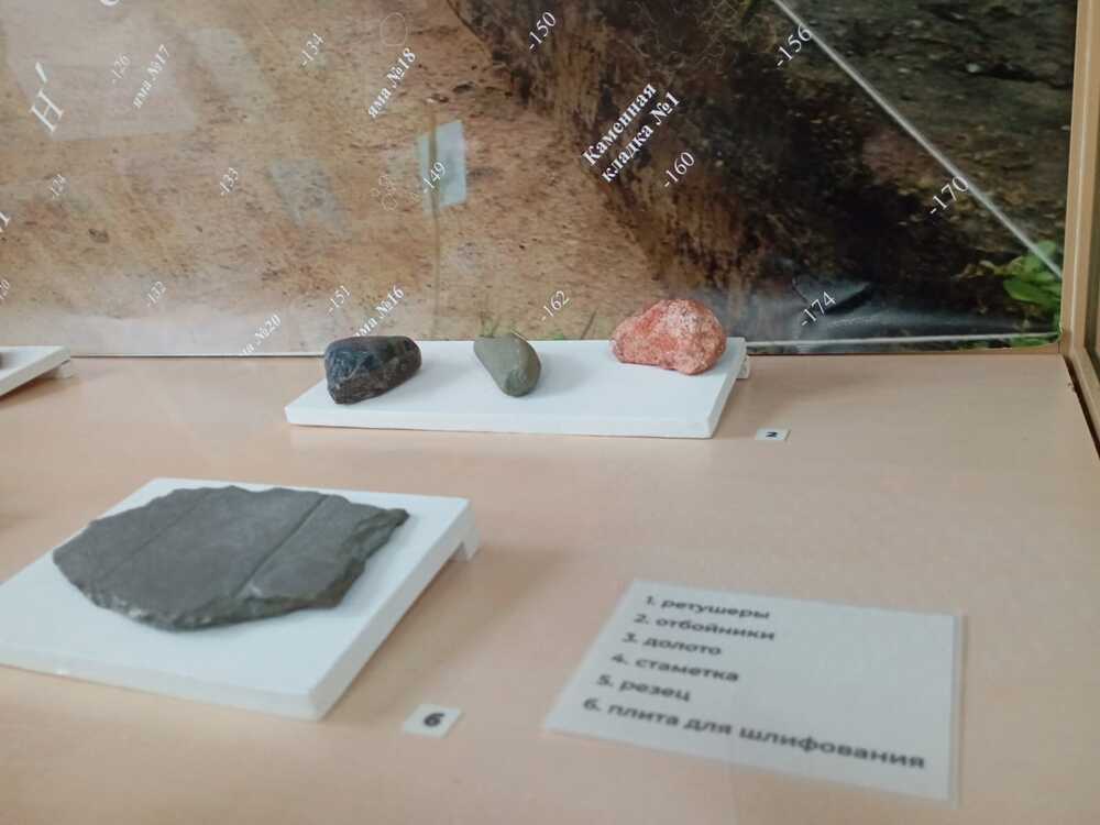 На выставке представлены древние скребки, ножи, проколки, стамески, выемчатые и долотовидные орудия, рассказывается о том, что в зависимости от орудия применялись различные приемы обработки подготовленного древним человеком сырья.