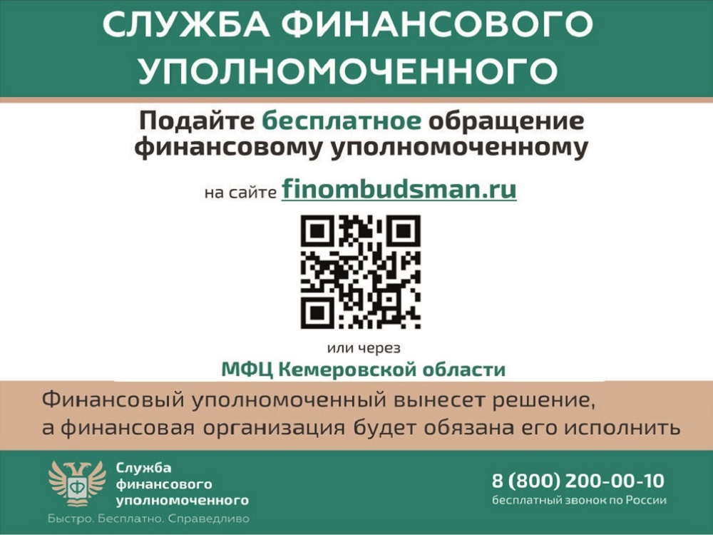 Финансовый уполномоченный решает имущественные (например, денежные) споры без суда между финансовыми организациями и их клиентами – физическими лицами. Это обязательный порядок решения споров по закону. Не нужно терять время и деньги на экспертизы и юристов. Вся процедура бесплатная: от приема обращения до принятия решения. Ваши обращения финансовый уполномоченный рассматривает 15 рабочих дней (по спорам, связанным с неправомерным переводом пенсионных накоплений, – 20 рабочих дней) – без вашего визита. Никуда не нужно ходить. Решение финансового уполномоченного обязательно для исполнения финансовой организацией. Вы можете подать обращение в отношении страховой компании, банка, микрофинансовой организации, негосударственного пенсионного фонда, ломбарда и кредитного потребительского кооператива. Проверьте свой спор на официальном сайте финансового уполномоченного finombudsman.ru: подлежит ли он рассмотрению финансовым уполномоченным? Это можно сделать, ответив всего на несколько простых вопросов. Перед подачей обращения финансовому уполномоченному – направьте заявление о восстановлении нарушенного права (претензию) в финансовую организацию, с которой у вас возник имущественный (например, денежный) спор. Если спор с финансовой организацией не урегулирован – подайте обращение финансовому уполномоченному на его официальном сайте или через МФЦ Кемеровской области. Более подробную информацию вы можете получить здесь.