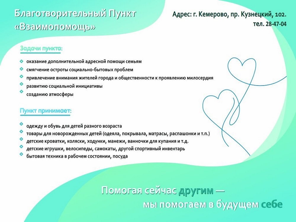 Управление социальной защиты населения администрации города Кемерово информирует Вас о новой мере социальной поддержки, действующей на территории Кемеровской области - Кузбасса, которой могут Воспользоваться семьи с детьми. В городе Кемерово открыт пункт проката предметов первой необходимости для новорожденных на базе МБУ «Центр социальной помощи семье и детям города Кемерово «Семейный центр», который расположен по адресу: г. Кемерово, ул. Пролетарская, 7а (телефон горячей линии 28-29-11). Воспользоваться услугами проката смогут следующие категории семей: - одинокие родители с ребенком в возрасте до 1,5 лет; - семьи с ребенком в возрасте до 1,5 лет, где один или оба супруга обучаются в образовательной организации по очной форме обучения; - многодетные семьи, имеющие ребенка до 1,5 лет; - семьи с ребенком-инвалидом, имеющие ребенка до 1,5 лет; - малоимущие семьи, имеющие ребенка до 1,5 лет; - семьи, находящиеся в трудной жизненной ситуации, имеющие ребенка до 1,5 лет. Для жителей города Кемерово предусмотрено 2545 единиц предметов первой необходимости для новорожденных, из них: коляски; кроватки; пеленальный столик; стул для кормления; ванна; манеж; ходунки; автолюльки; автокресло; весы; шезлонги; видеоняня; санки-коляски. Для семей предусмотрены выставочные образцы и электронный сервис перечня оборудования с фотографиями (center-pomoschi.kmr.socinfo.ru). Информируем Вас также о работе на территории города Кемерово благотворительного пункта «Взаимопомощь» по приему вещей от населения и предметов первой необходимости для детей, который также располагается на базе МБУ «Центр социальной помощи семье и детям города Кемерово «Семейный центр», по адресу: г. Кемерово, просп. Кузнецкий, 102 (телефон 28-47-04). В благотворительный пункт «Взаимопомощь» принимают одежду и обувь для детей, беременных женщин, детские коляски, кроватки, велосипеды, санки, вещи для новорожденных, детскую посуду, подгузники, игрушки, книги, диски с детскими мультфильмами, канцелярские товары, бытовую технику и др. Принимаются вещи, находящиеся в хорошем состоянии, чистые и опрятные, готовые к повторному использованию.