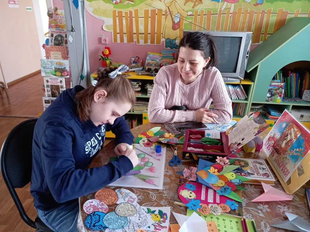 В преддверии Пасхи в Детской библиотеке им. А М. Береснева работала выставка-мастерская «Христос Воскресе!», где читатели знакомились с православными традициями и тут же, на мастер-классе «Пасхальная палитра», учились делать пасхальные сувениры, открытки и корзиночки в техниках аппликации и оригами. Самые любознательные даже попробовали освоить азы церковнославянского языка.